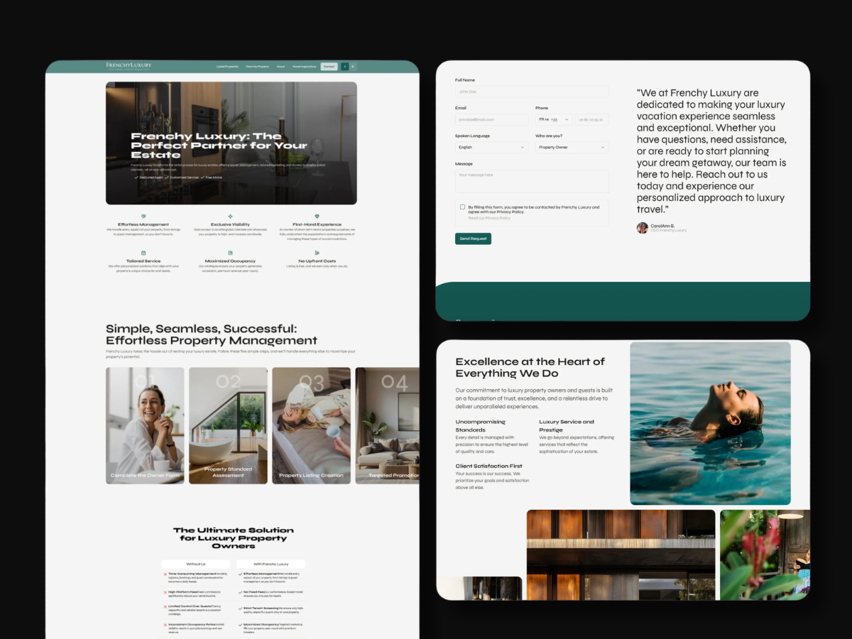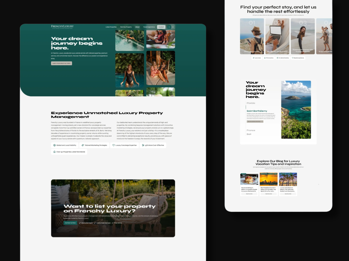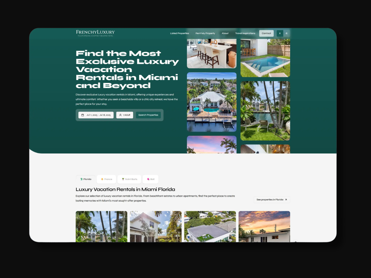 Frenchy Luxury est une extension haut de gamme du groupe Frenchy Homes. L'objectif était de créer une plateforme de réservation en direct pour des biens d'exception (France, Floride, St-Barth), permettant de contourner les frais des géants du secteur tout en garantissant un service "cinq étoiles".