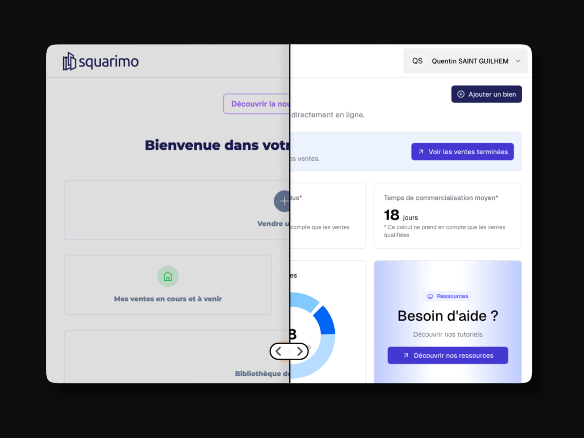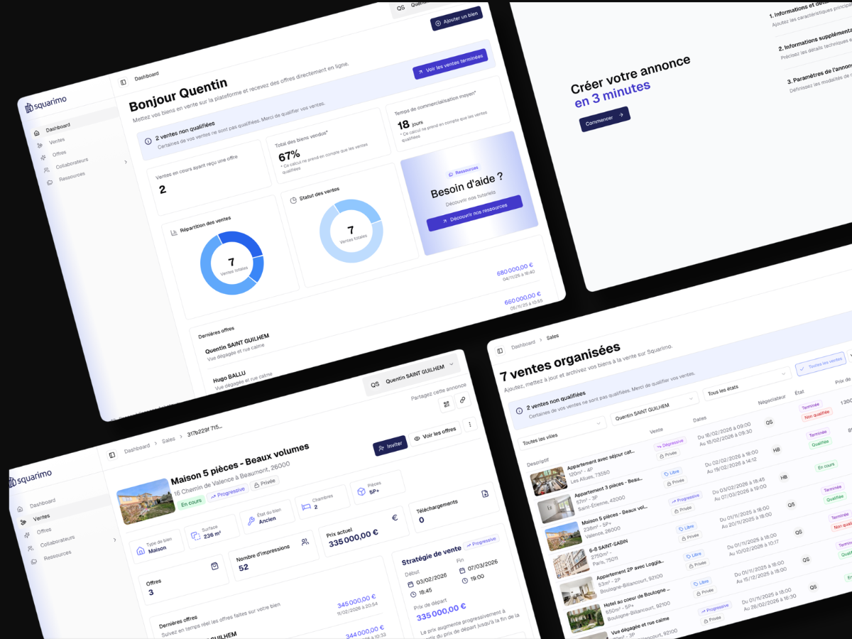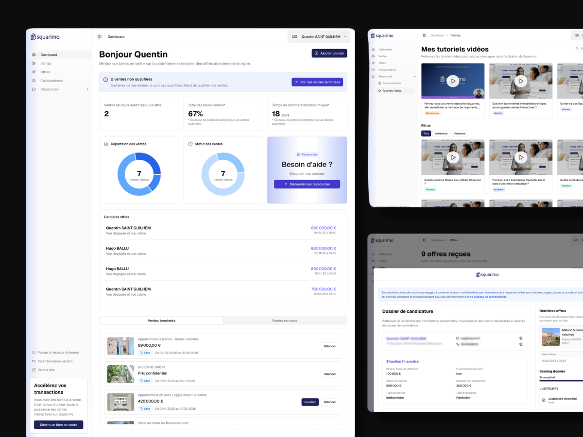 Squarimo bouscule l'immobilier avec une plateforme de vente interactive (enchères transparentes). Le projet initial souffrait d'une interface peu engageante et d'un parcours utilisateur confus, freinant son adoption par des partenaires majeurs comme Foncia.