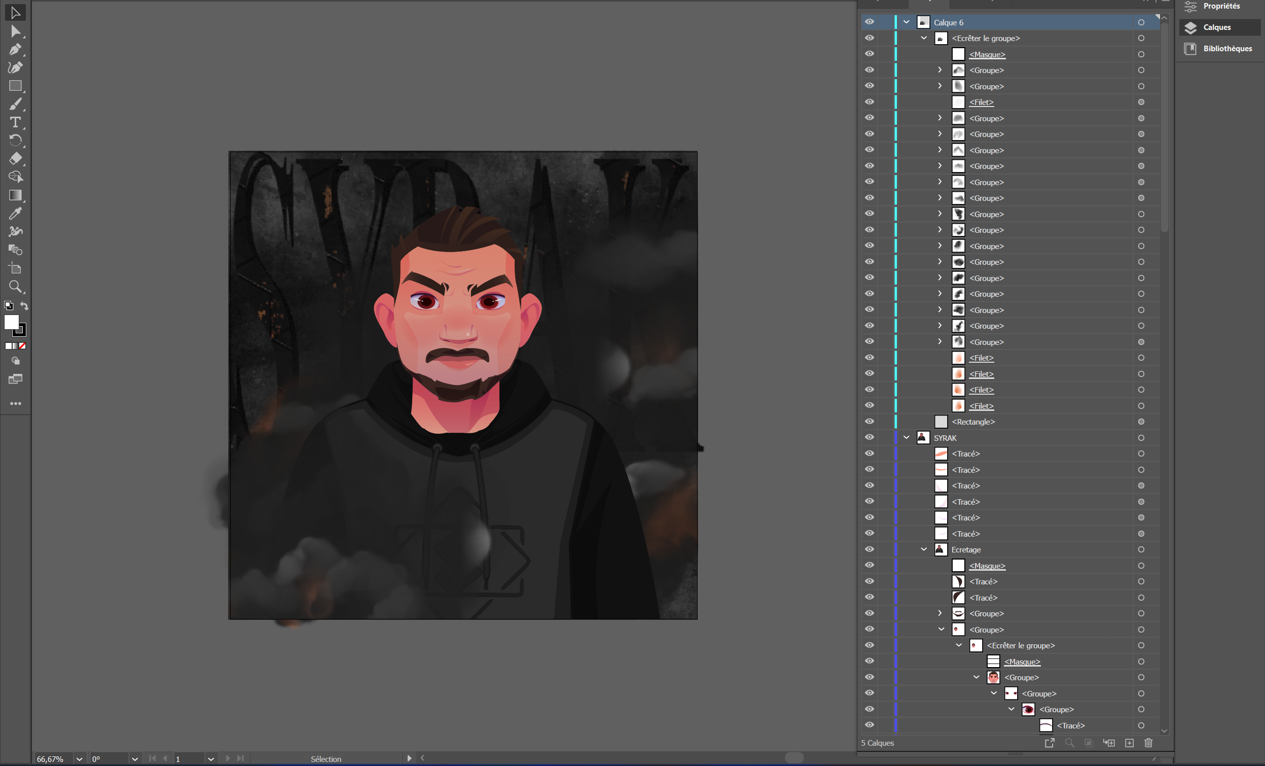 Concernant l’album de Syrak, la demande était plus complexe. Il était question de représenter graphiquement le chanteur, en mettant en avant le côté sombre de l’auteur afin de mettre en avant ses textes. Egalement, de nombreuses composantes design ont été précisées dans le cahier des charges afin d’obtenir un résultat riche de sens et en lien avec les problématiques évoquées dans les chansons.